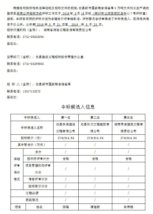 攸縣新市國家糧食儲備庫2萬噸大米加工生產線改建項目 招標投標信息公示表