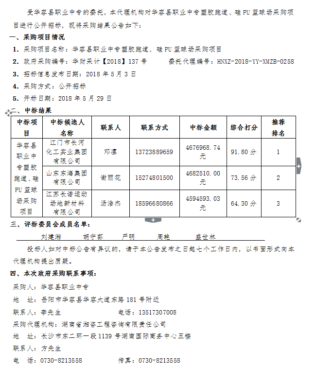 華容縣職業(yè)中專塑膠跑道、硅PU籃球場采購項目公開招標中標公告