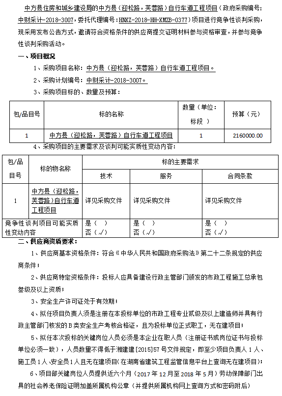 中方縣(迎松路,芙蓉路)自行車道工程項(xiàng)目競爭性談判公告