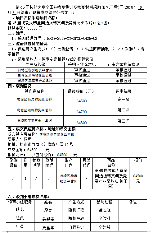 第45屆技能大賽全國選拔賽集訓及競賽材料采購 (B包工量) 競爭性談判成交公告