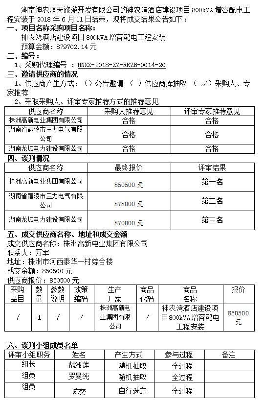 神農灣酒店建設項目800kVA增容配電工程安裝 競爭性談判成交公告