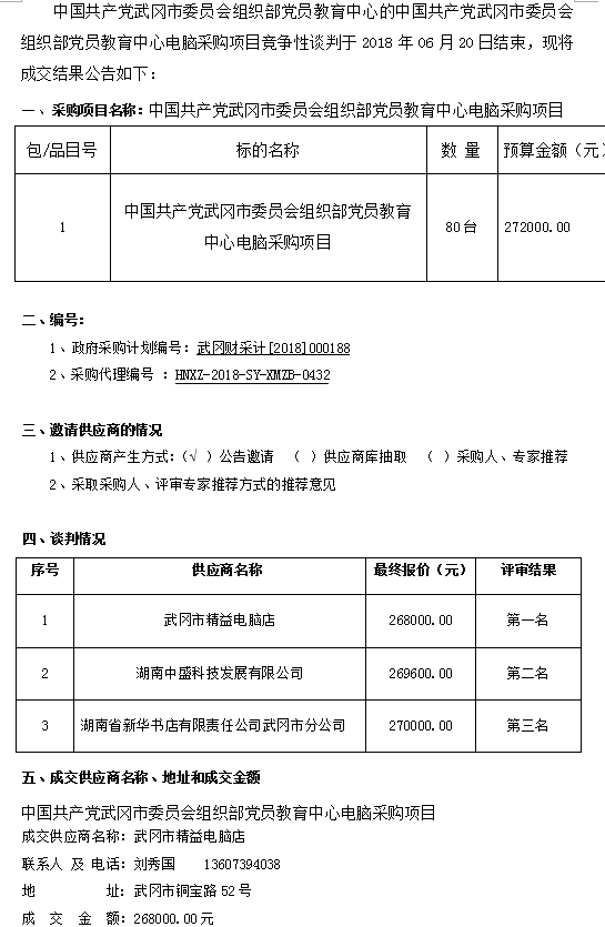 中國共產(chǎn)黨武岡市委員會組織部黨員教育中心電腦采購項目 競爭性談判成交結(jié)果公告