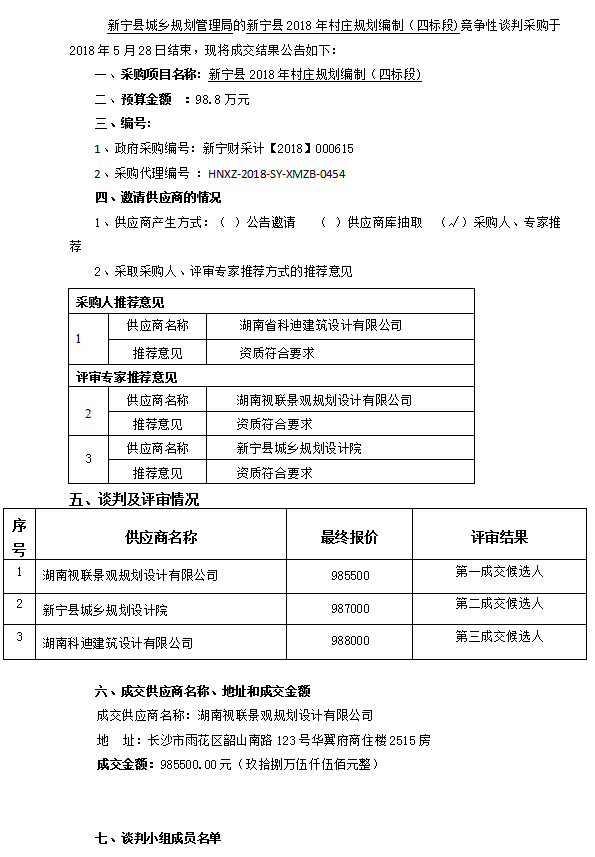 新寧縣2018年村莊規劃編制(四標段) 競爭性談判成交結果公告