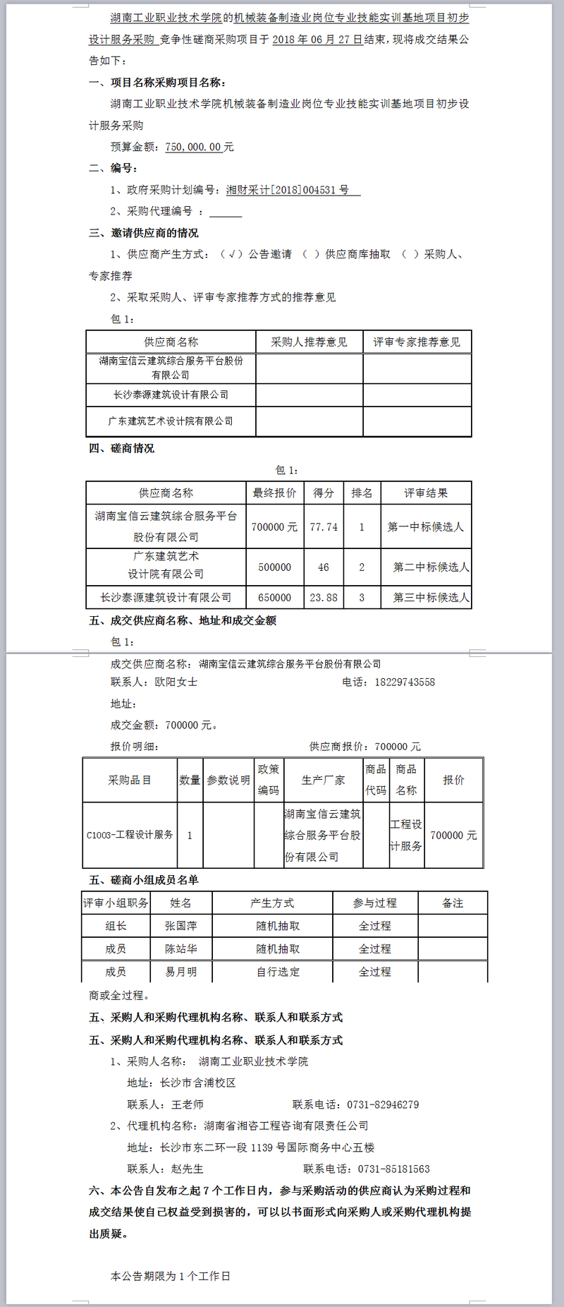 湖南工業職業技術學院機械裝備制造業崗位專業技能實訓基地項目初步設計服務采購競爭性磋商成交公告