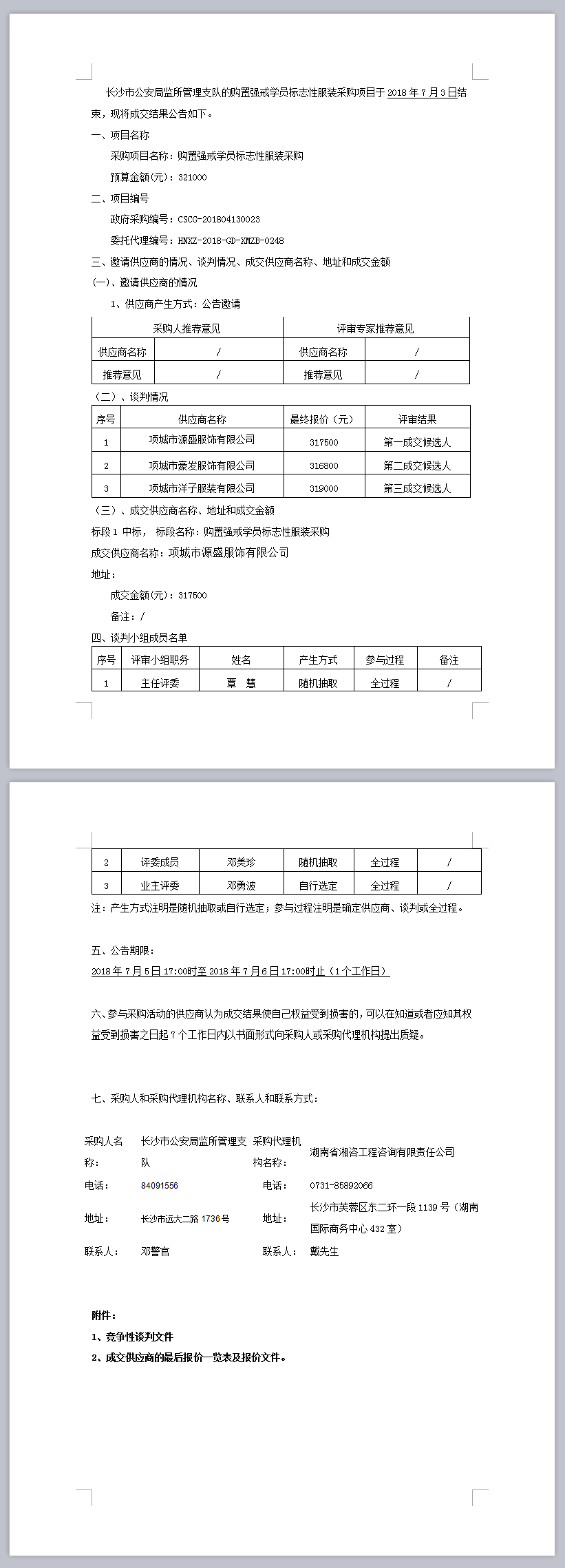 長沙市公安局監(jiān)所管理支隊(duì)購置強(qiáng)戒學(xué)員標(biāo)志性服裝采購結(jié)果公告