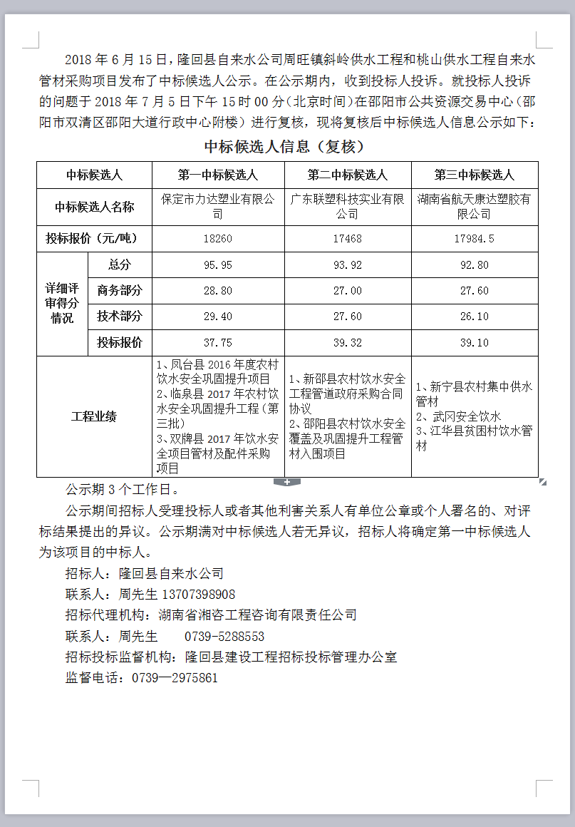 隆回縣自來水公司周旺鎮斜嶺供水工程和桃山供水工程自來水管材采購項目招標投標信息公示表(復核)