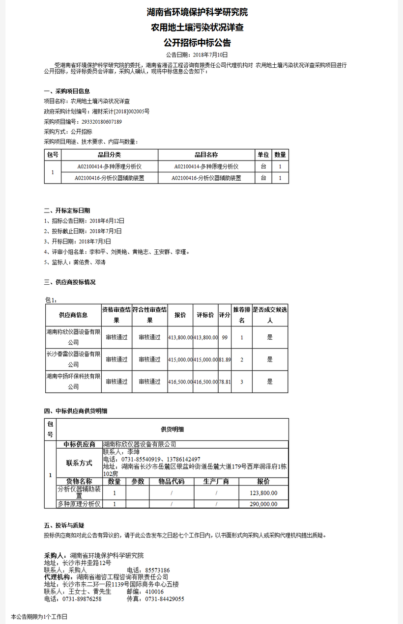湖南省環境保護科學研究院農用地土壤污染狀況詳查公開招標中標公告