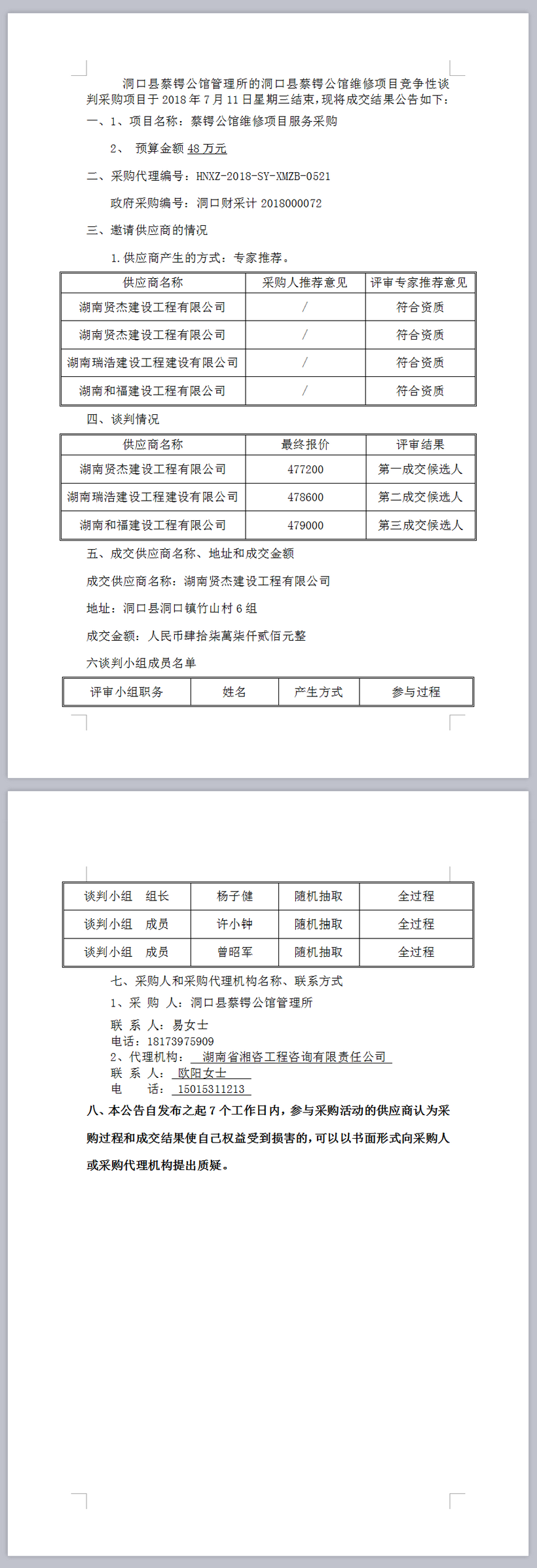 洞口縣蔡鍔公館管理所蔡鍔公館維修項目競爭性談判成交公告