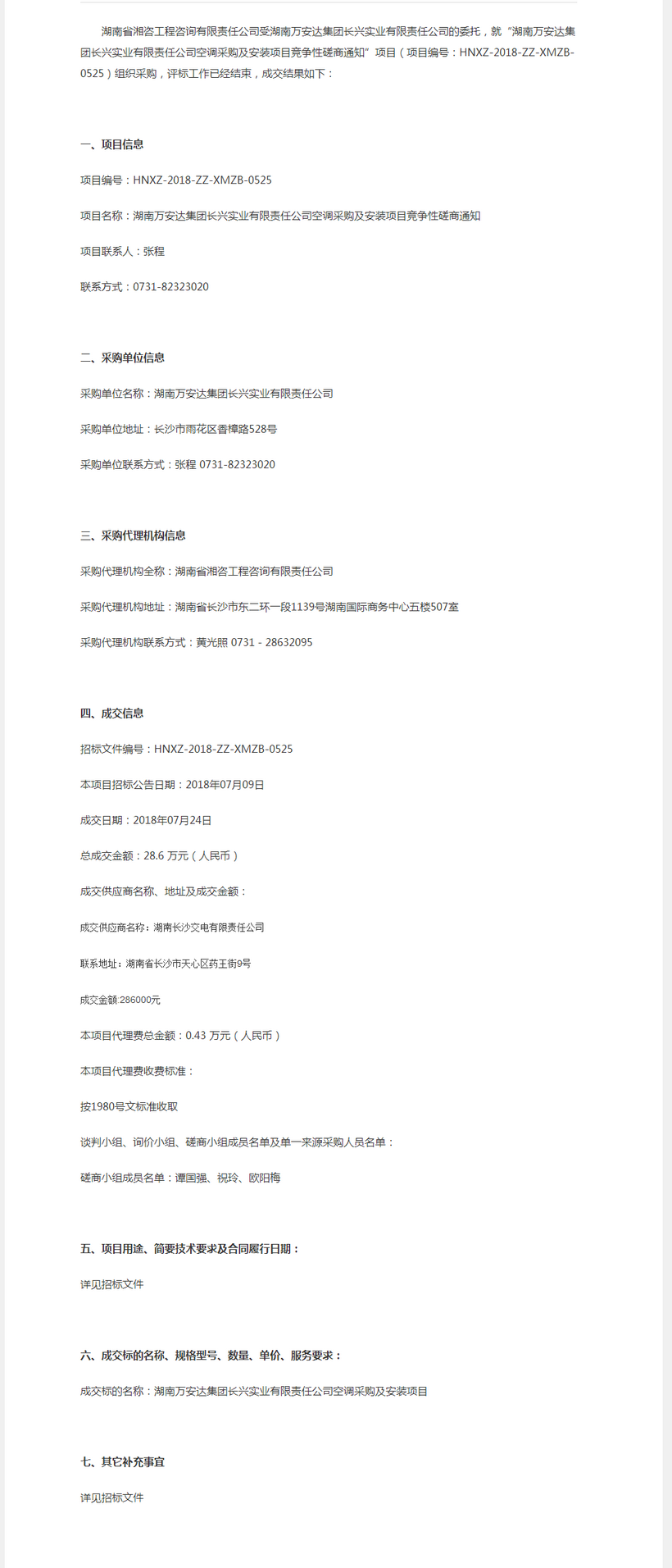 湖南萬安達(dá)集團(tuán)長興實(shí)業(yè)有限責(zé)任公司空調(diào)采購及安裝項(xiàng)目競(jìng)爭性磋商通知成交公告