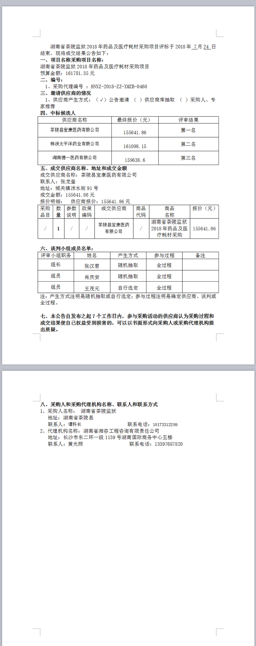 湖南省茶陵監獄2018年藥品及醫療耗材采購項目成交公告