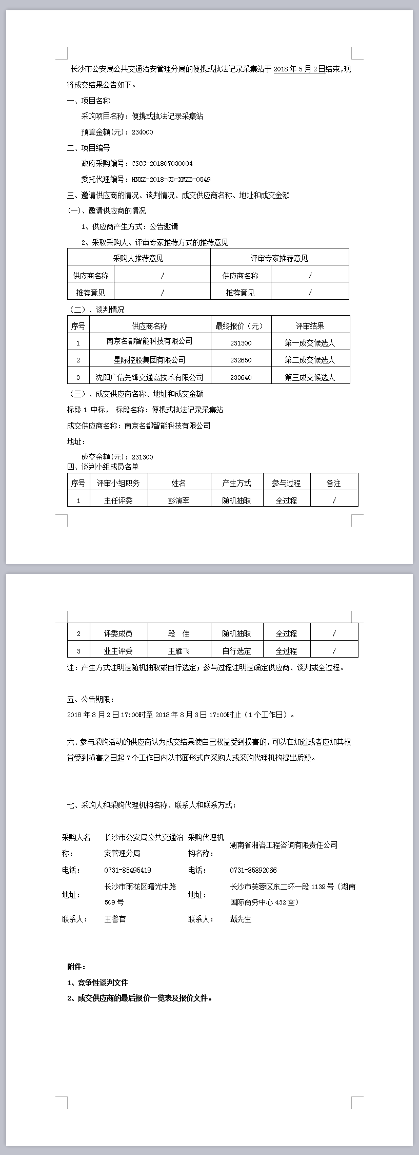 長沙市公安局公共交通治安管理分局便攜式執(zhí)法記錄采集站結(jié)果公告