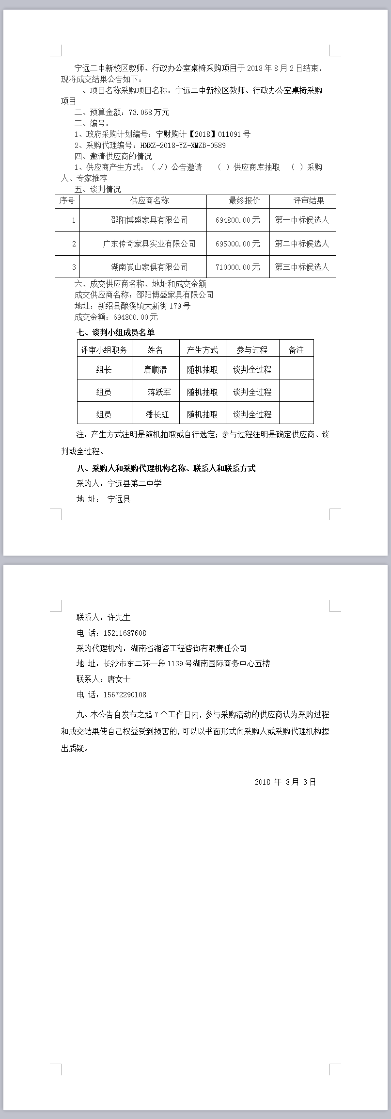 寧遠二中新校區教師、行政辦公室桌椅采購項目競爭性談判成交結果公告
