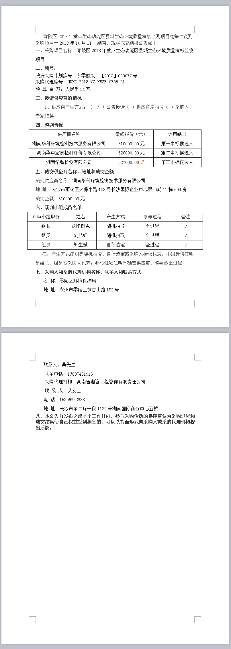 零陵區2018年重點生態功能區縣域生態環境質量考核監測項目 競爭性談判成交公告