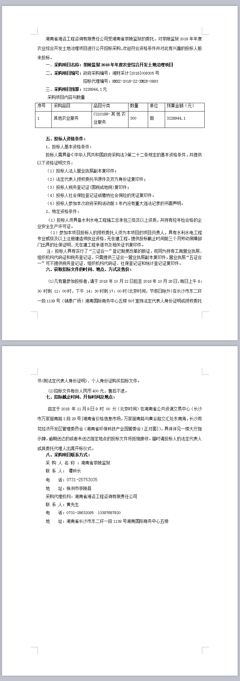 茶陵監獄2018年年度農業綜合開發土地治理項目招標公告