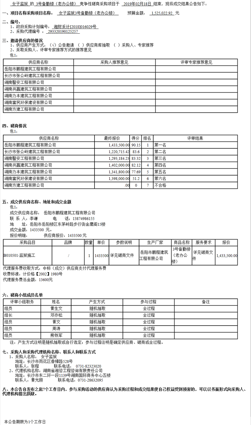 湖南省女子監獄3號備勤樓(老辦公樓)工程 項目成交結果公告