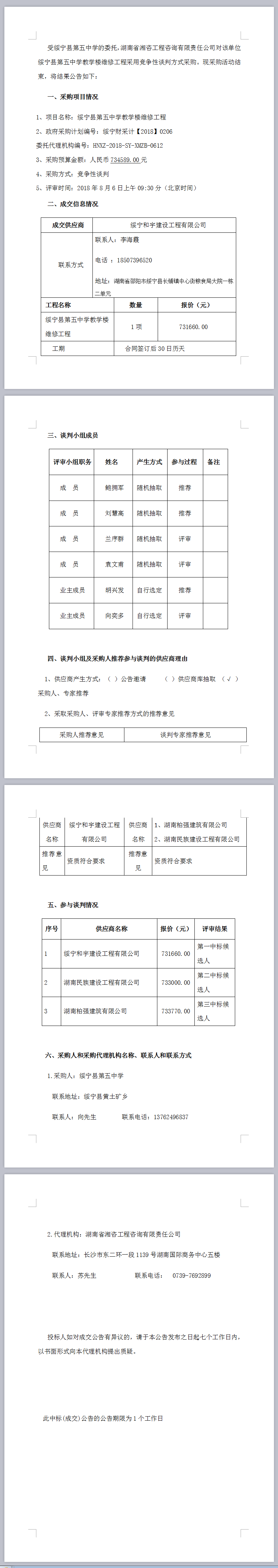綏寧縣第五中學教學樓維修工程談判成交公告
