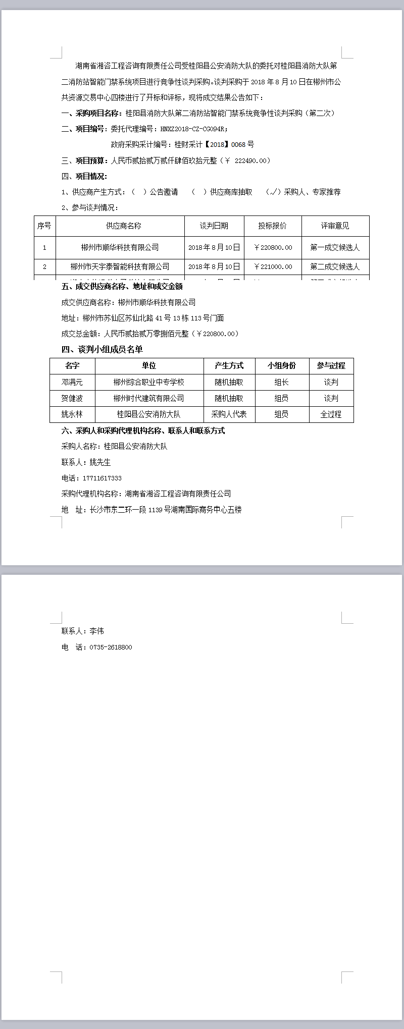 桂陽縣消防大隊第二消防站智能門禁系統競爭性談判采購(第二次)成交公告