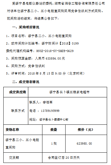綏寧縣二小、三小電腦室采購談判成交公告