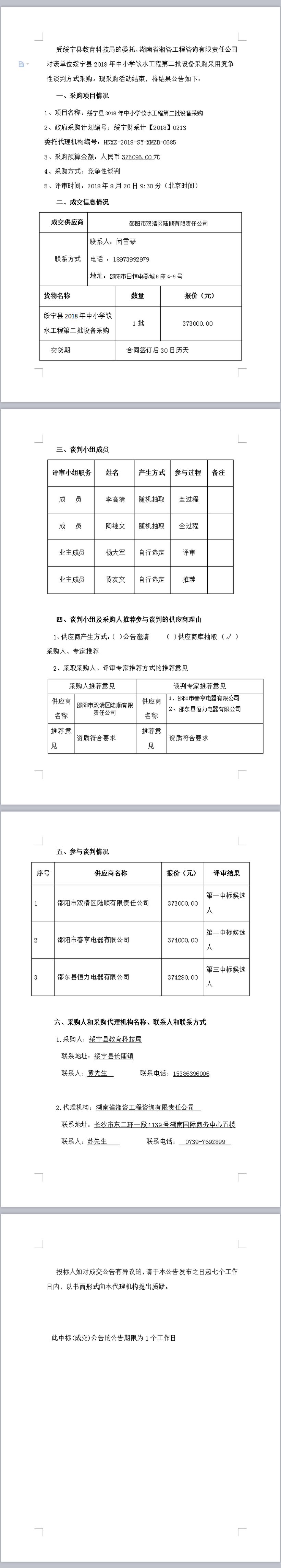 綏寧縣2018年中小學(xué)飲水工程第二批設(shè)備采購談判成交公告