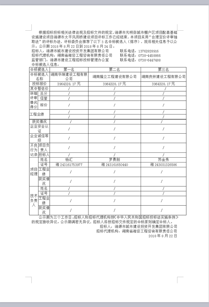 漣源市光明街城市棚戶區項目配套基礎設施建設項目漣源市太平風雨橋建設項目中標候選人公示