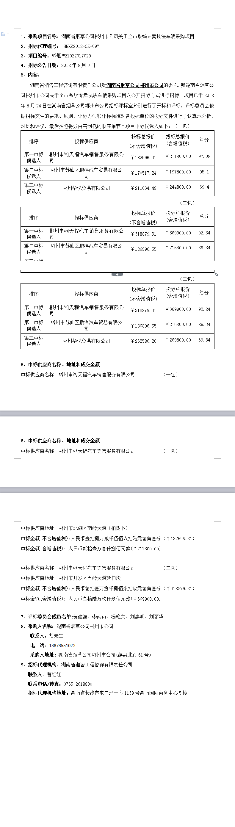 湖南省煙草公司郴州市公司關于全市系統專賣執法車輛采購項目中標結果公示