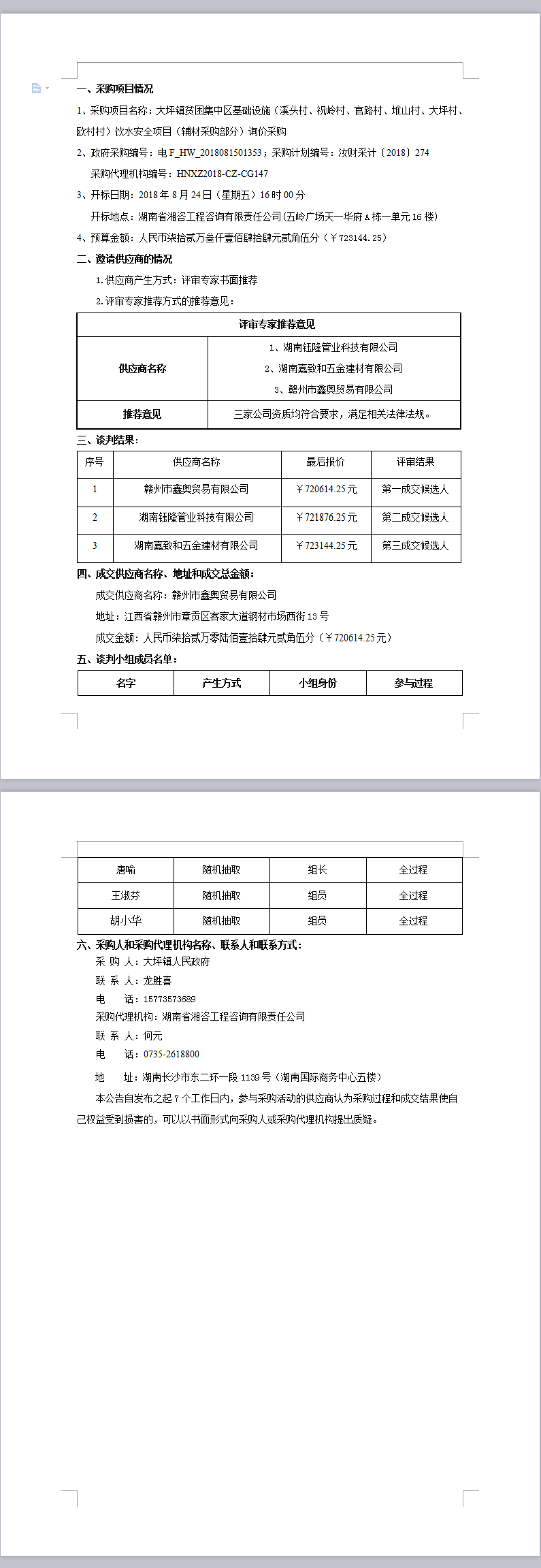 大坪鎮貧困集中區基礎設施(溪頭村、祝嶺村、官路村、堆山村、大坪村、歐村村)飲水安全項目(輔材采購部分)詢價采購成交公告