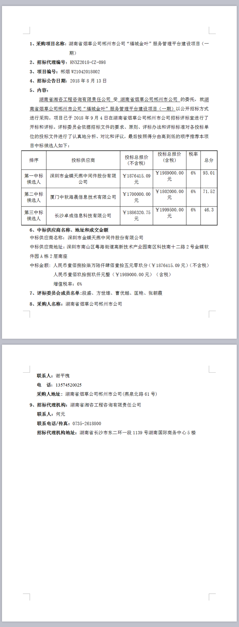 湖南省煙草公司郴州市公司“福城金葉”服務(wù)管理平臺 建設(shè)項(xiàng)目(一期)中標(biāo)結(jié)果公示