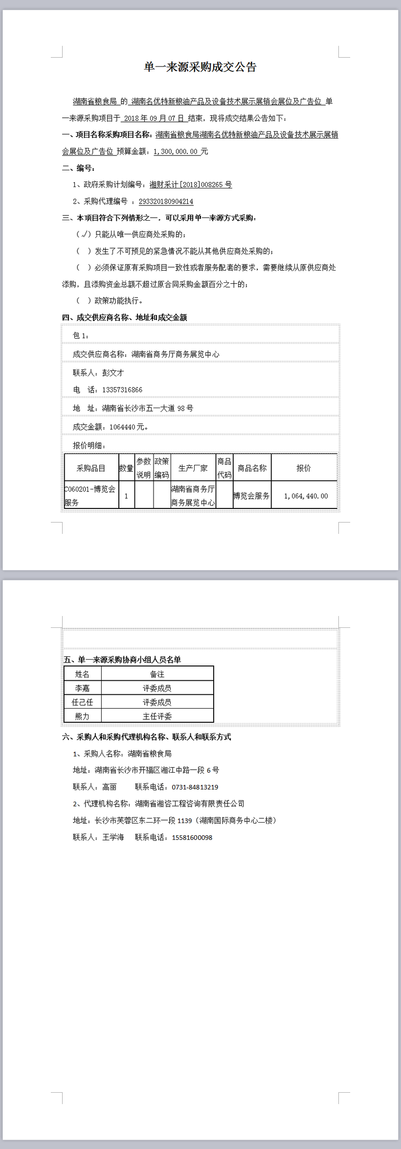 湖南省糧食局湖南名優特新糧油產品及設備技術展示展銷會展位及廣告位單一來源采購成交公告