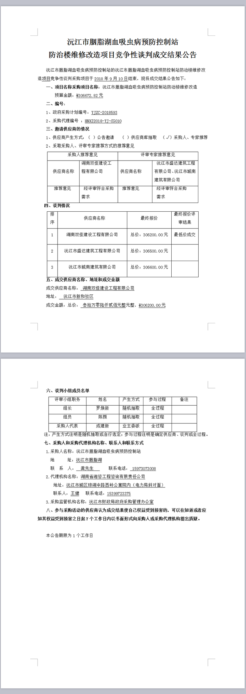 沅江市胭脂湖血吸蟲病預防控制站防治樓維修改造項目競爭性談判成交結果公告