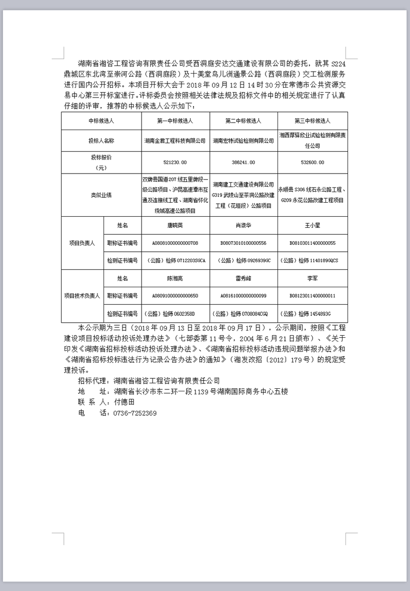 S224鼎城區東北灣至崇河公路(西洞庭段)及十美堂鳥兒洲通景公路(西洞庭段)交工檢測服務中標候選人公示