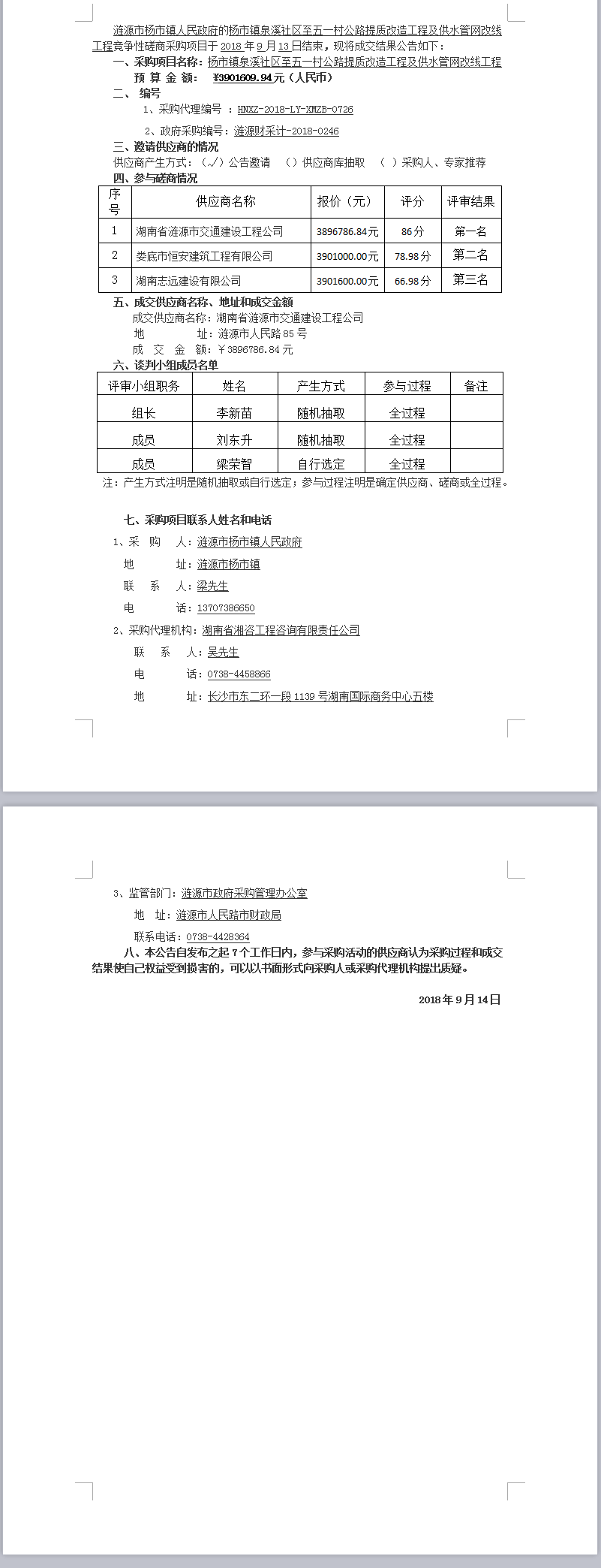 楊市鎮泉溪社區至五一村公路提質改造工程及供水管網改線工程競爭性磋商成交結果公告