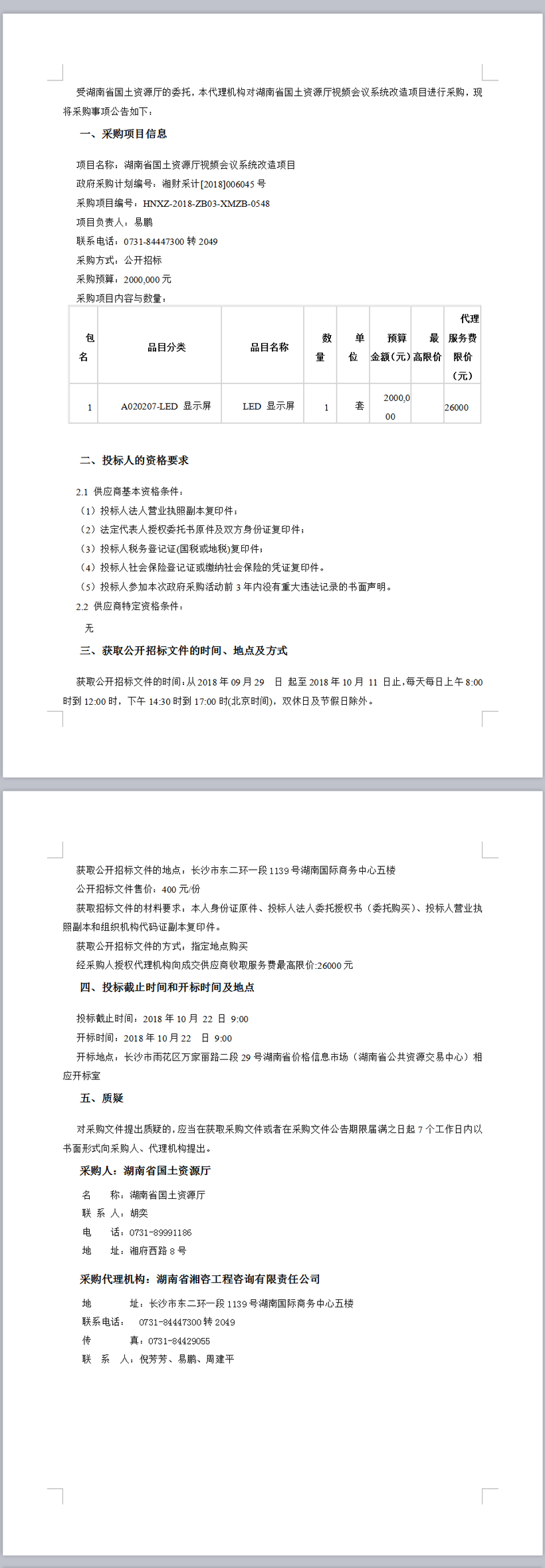 湖南省國土資源廳視頻會議系統改造項目招標公告