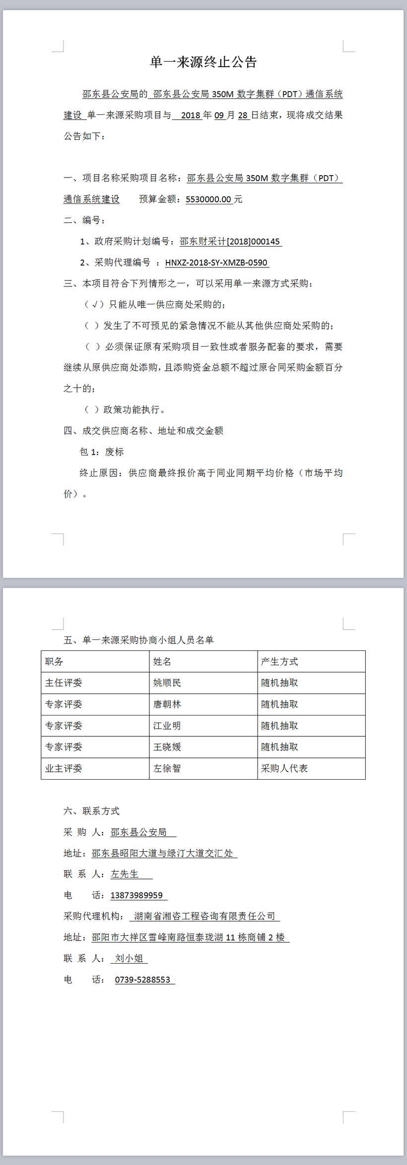 邵東縣公安局350M數字集群(PDT)通信系統建設單一來源終止公告