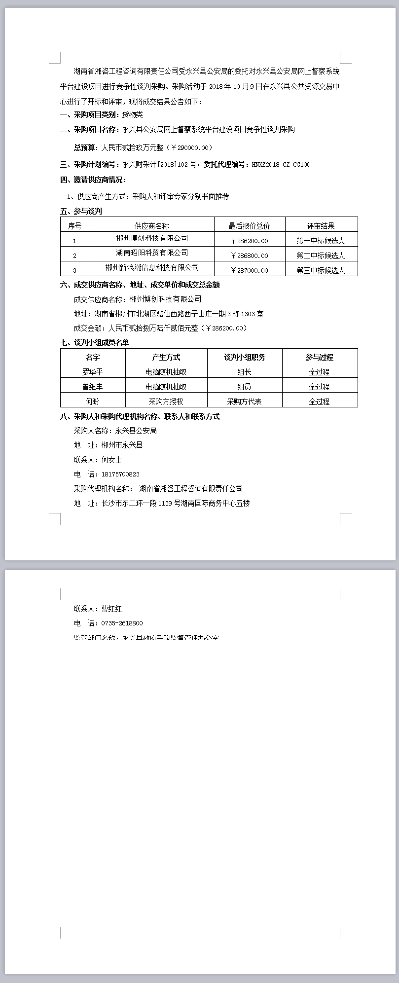 永興縣公安局網上督察系統平臺建設項目競爭性談判采購成交公告