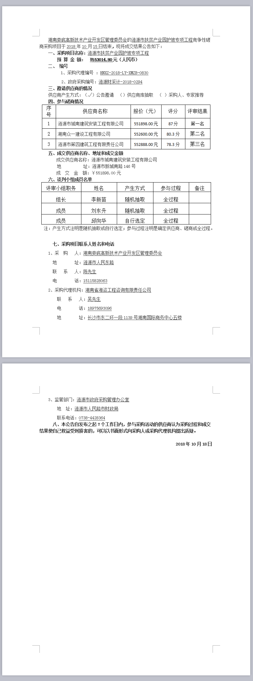 漣源市扶貧產業園護坡專項工程 競爭性磋商成交結果公告