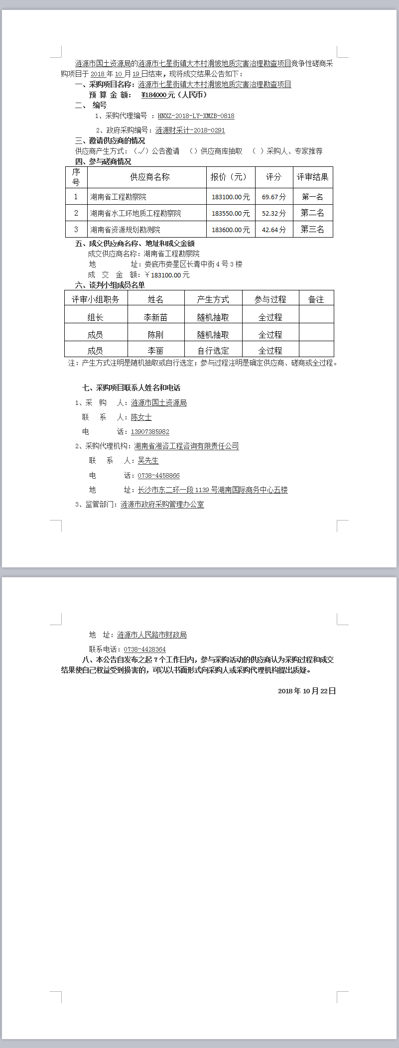 漣源市七星街鎮(zhèn)大木村滑坡地質(zhì)災(zāi)害治理勘查項(xiàng)目競爭性磋商成交結(jié)果公告