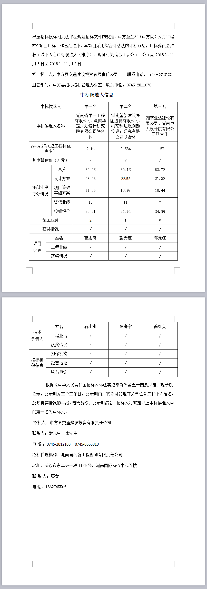 中方至芷江(中方段)公路工程EPC項(xiàng)目中標(biāo)候選人公示