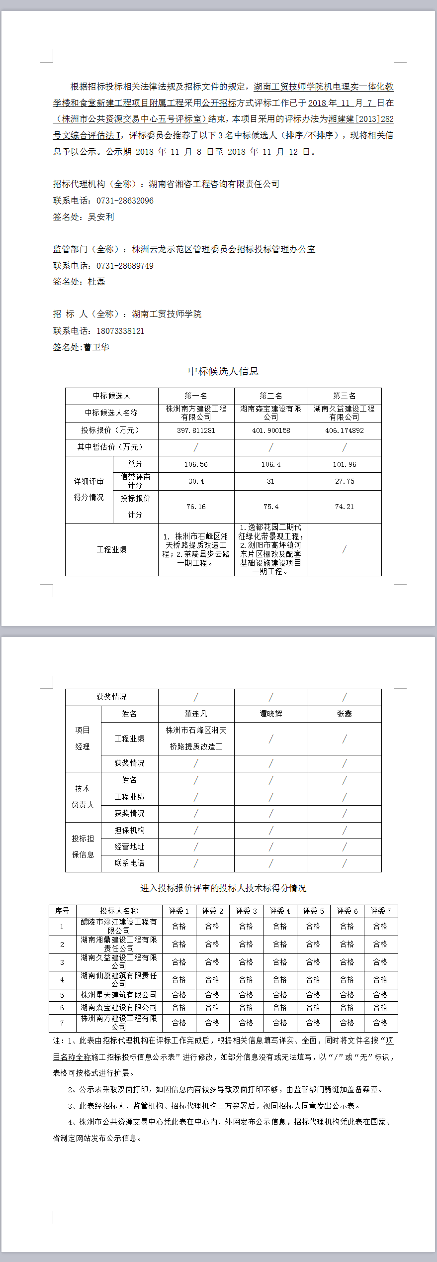 湖南工貿技師學院機電理實一體化教學樓和食堂新建工程項目附屬工程招標投標信息公示表