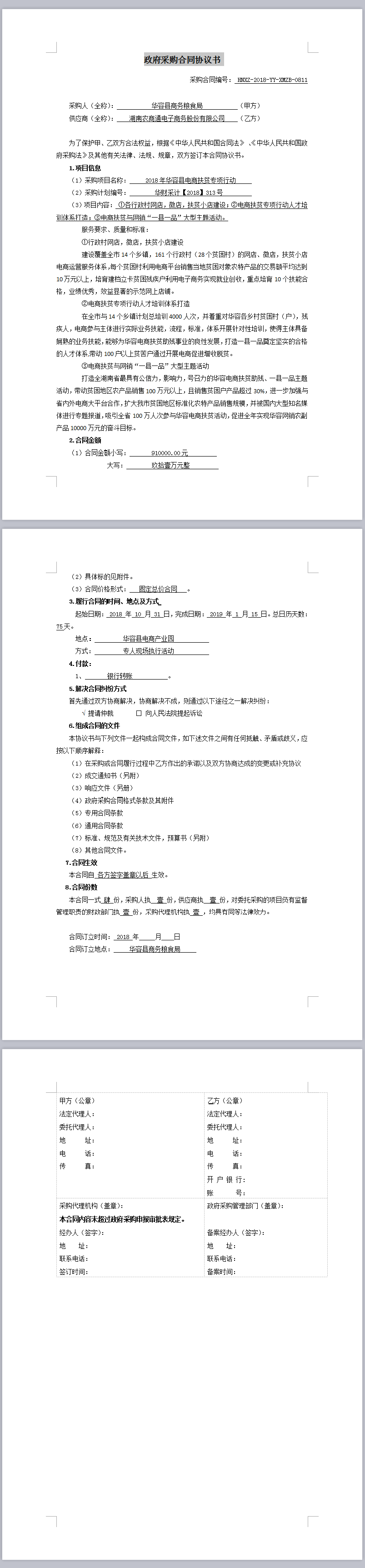 2018年華容縣電商扶貧專項行動政府采購合同協議書