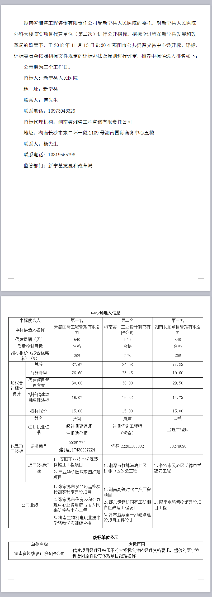 新寧縣人民醫院外科大樓EPC項目代建單位(第二次) 招標投標信息公示表