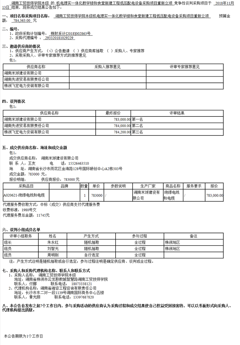 湖南工貿(mào)技師學(xué)院本級(jí)機(jī)電理實(shí)一體化教學(xué)樓和食堂新建工程低壓配電設(shè)備采購(gòu)項(xiàng)目競(jìng)爭(zhēng)性談判成交公告