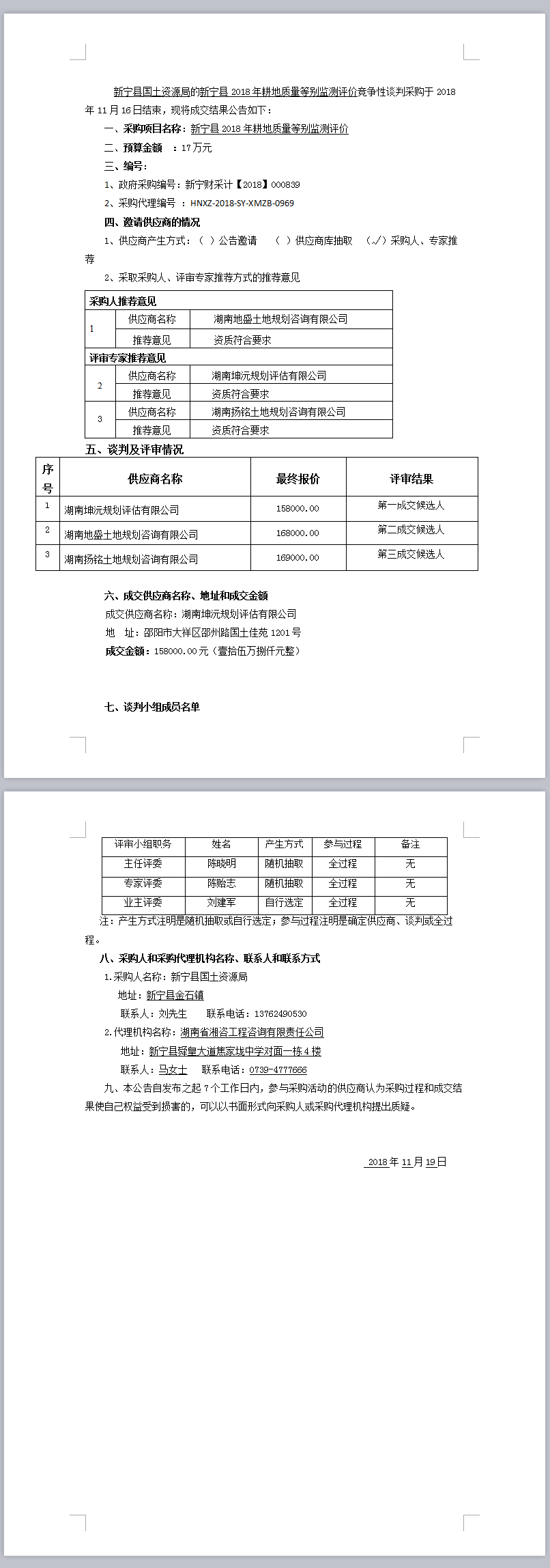 新寧縣2018年耕地質量等別監測評價競爭性談判成交結果公告