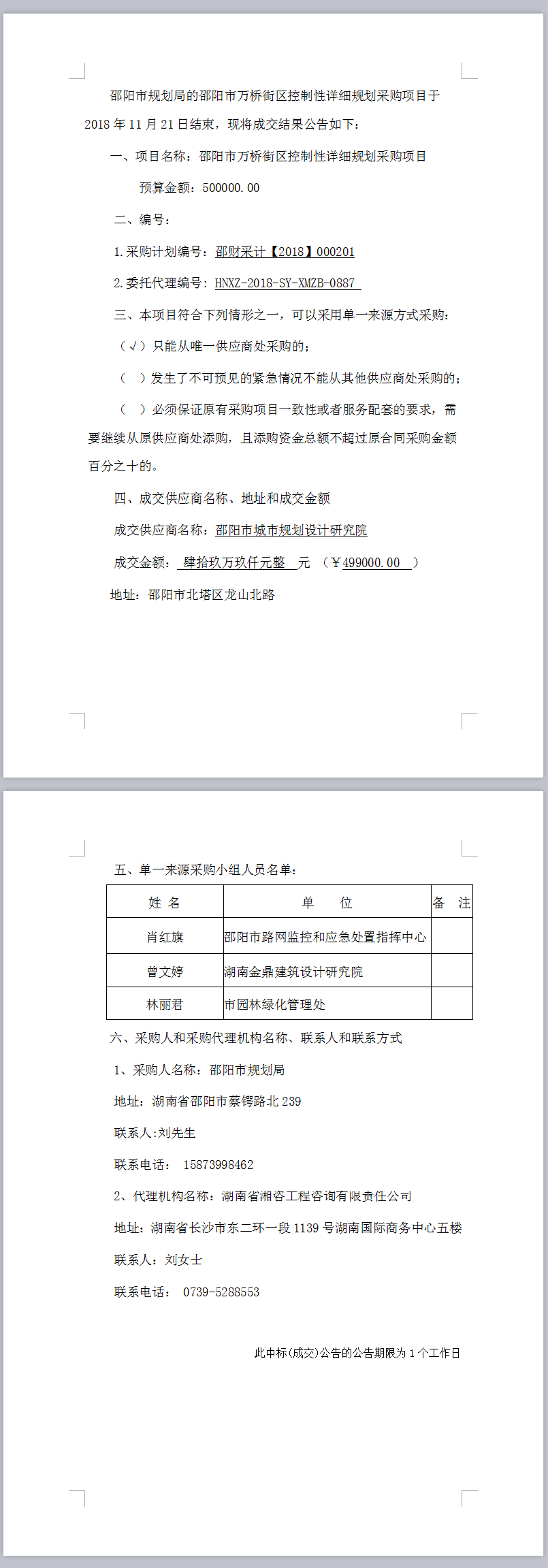 邵陽市萬橋街區控制性詳細規劃采購項目 單一來源成交公告