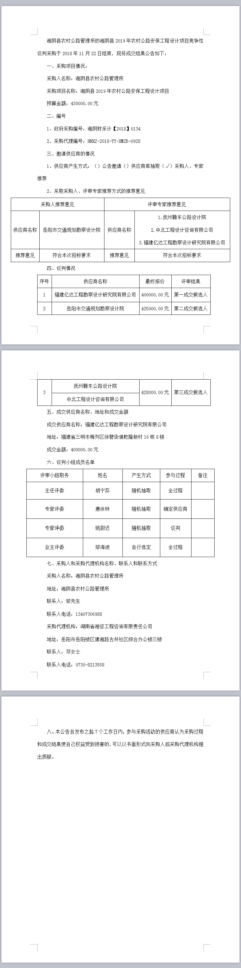 湘陰縣2019年農村公路安保工程設計項目競爭性談判成交結果公告