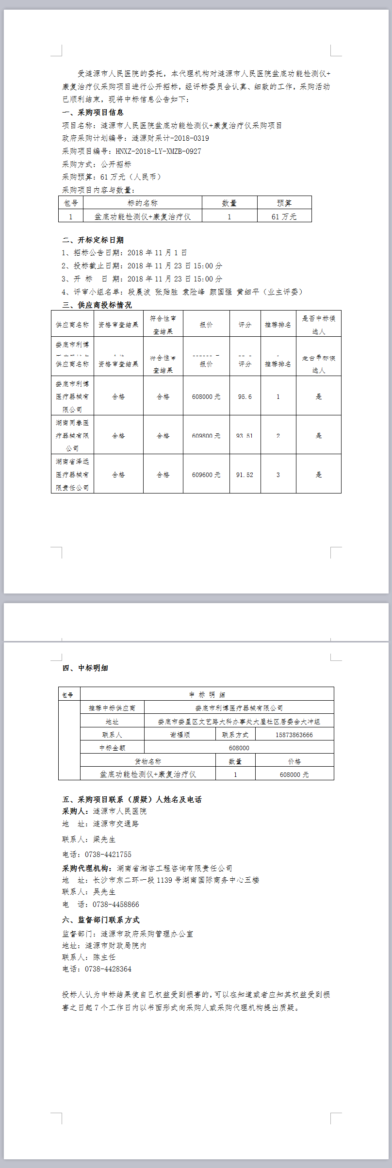 漣源市人民醫院盆底功能檢測儀+康復治療儀采購項目中標結果公告