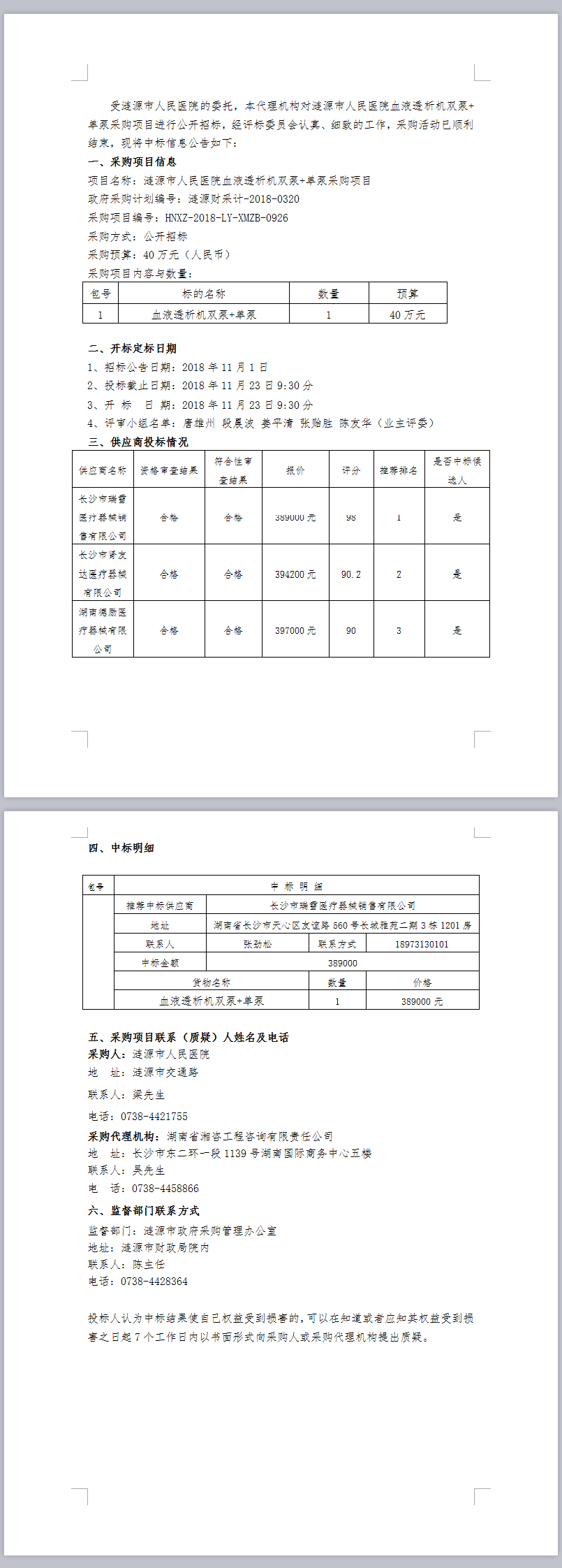 漣源市人民醫院血液透析機雙泵+單泵采購項目中標結果公告