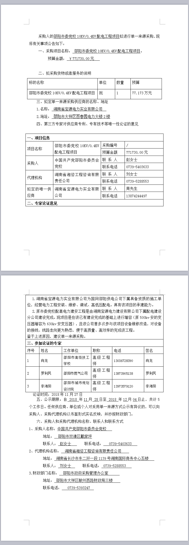 邵陽市委黨校10KV/0.4KV配電工程項目單一來源論證公示