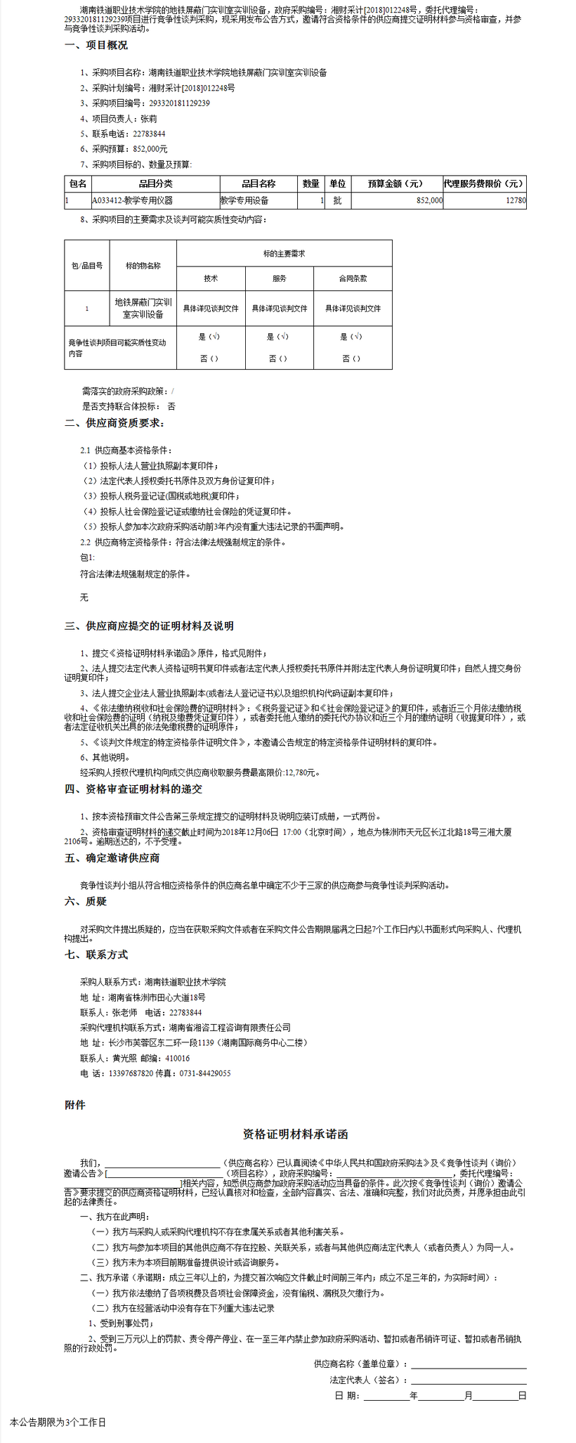 湖南鐵道職業技術學院地鐵屏蔽門實訓室實訓設備項目競爭性談判邀請公告