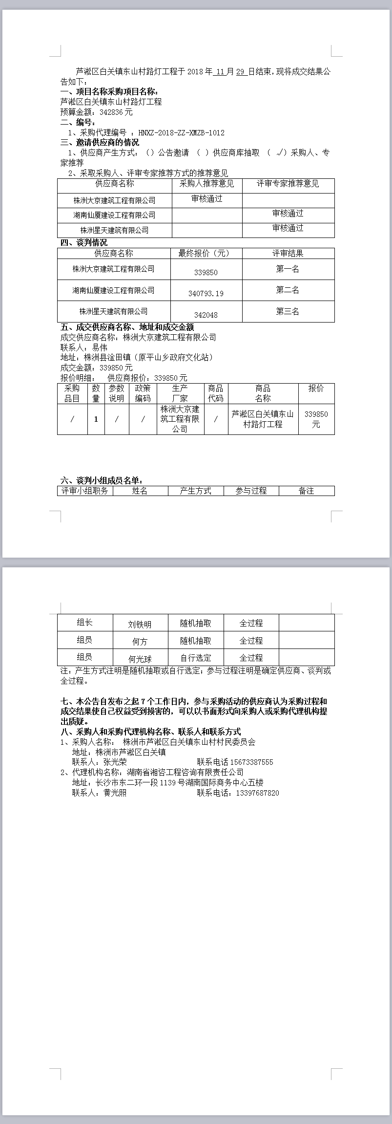 蘆淞區白關鎮東山村路燈工程 競爭性談判成交公告