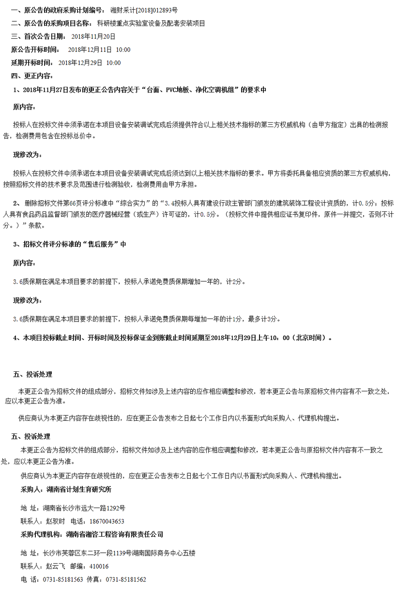 湖南省計劃生育研究所科研樓重點實驗室設(shè)備及配套安裝項目公開招標更正公告(2)